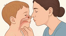 - Если предмет не вышел — переверните малыша на спину и выполните до 5 нажатий двумя пальцами на нижнюю половину грудины.