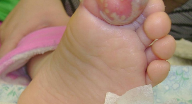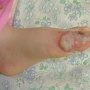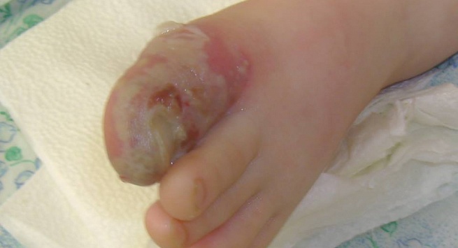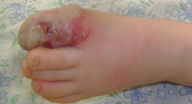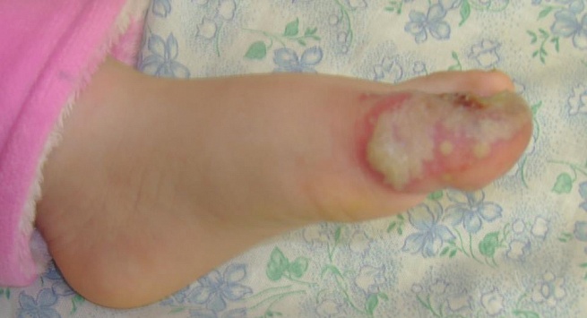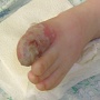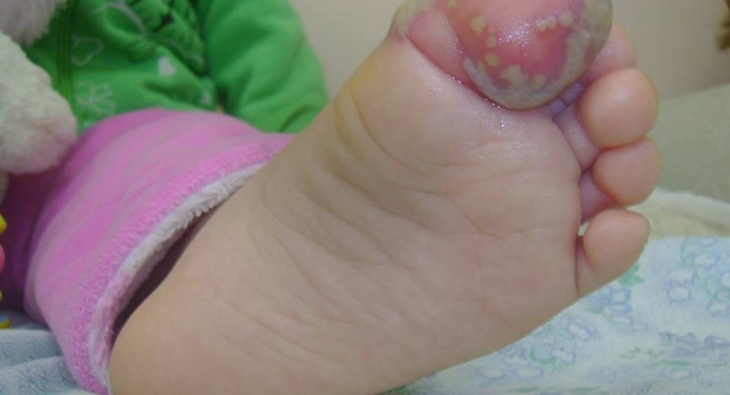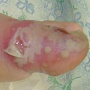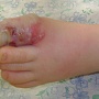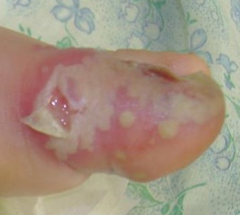 Местно: все пузырьки туго и обильно заполнены белым гноем. В тех местах, где везикулы располагались особенно плотно - они слились в буллы, содержащие довольно большое количество гноя. Отек выраженный. Палец - горячий на ощупь. Отек распространился до середины тыла стопы. Буллы вскрыты стерильной иглой от шприца, Y-образными разрезами, края разведены, раны промыты 3% перекисью водорода, струей.
