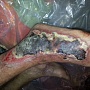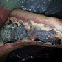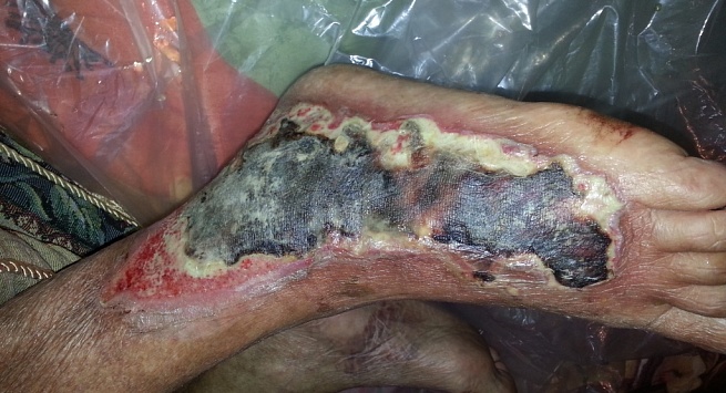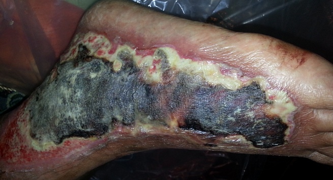 Пациент 75 лет, из известных заболеваний - плохо леченный ХОБЛ. Картина на фото развилась на фоне относительного благополучия. Принимал варфарин, что характерно без контроля МНО. Через месяц от начала приема (2,5 - 5 мг) множественные синяки, кровоизлияния, гематомы. несколько участков некроза кожи разной степени выраженности. Наиболее яркий фрагмент представлен на фото.